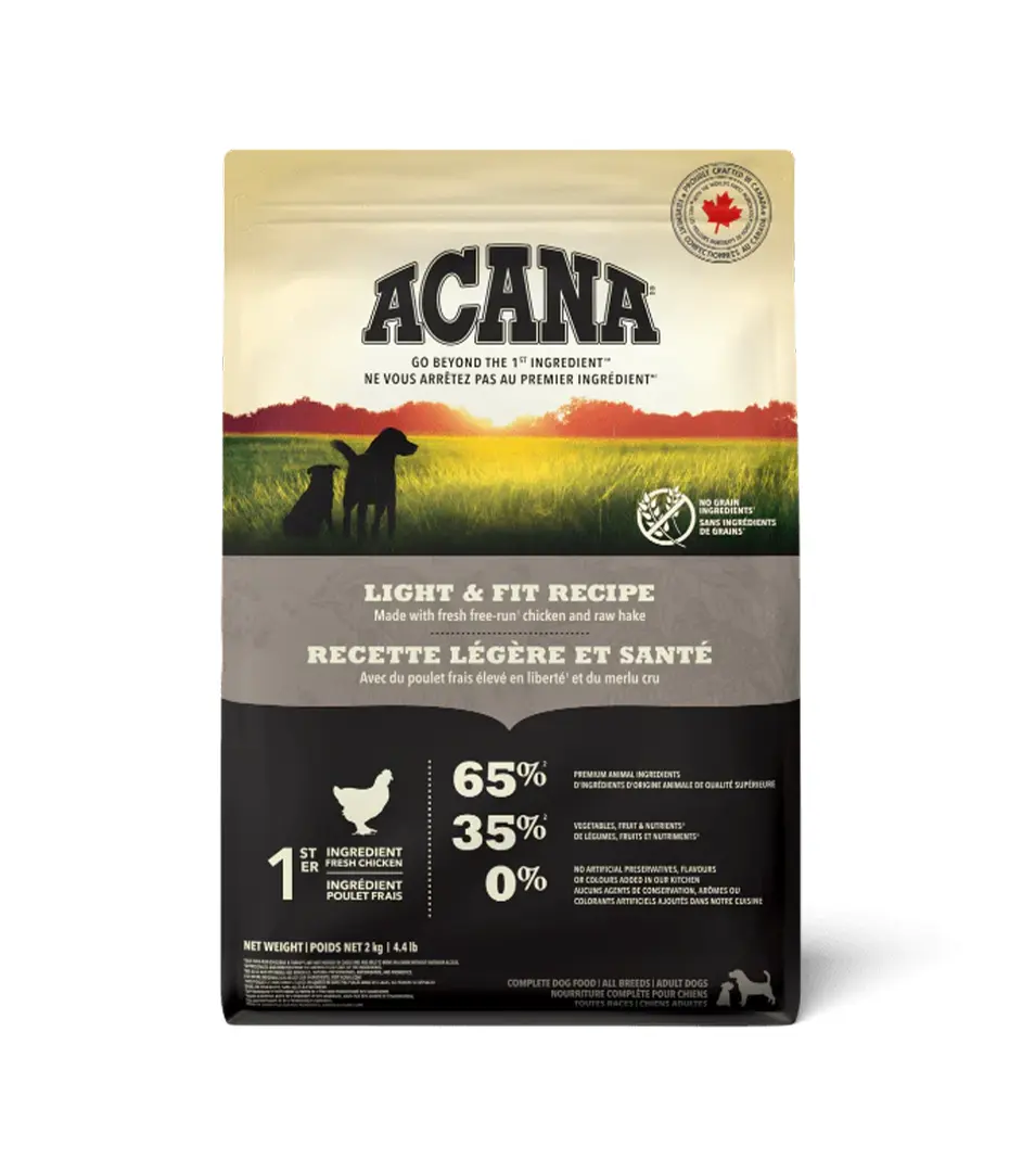 ACANA LIGHT&FIT RECIPE je kompletné krmivo vhodné pre psov všetkých plemien od jedného roka. Obsahuje voľne chované kurčatá, morky, vajcia a voľne lovené ryby. Granule majú znížené množstvo sacharidov a kalórií, vďaka čomu bojujú s hmotnosťou pri nadváhe alebo po kastrácii.