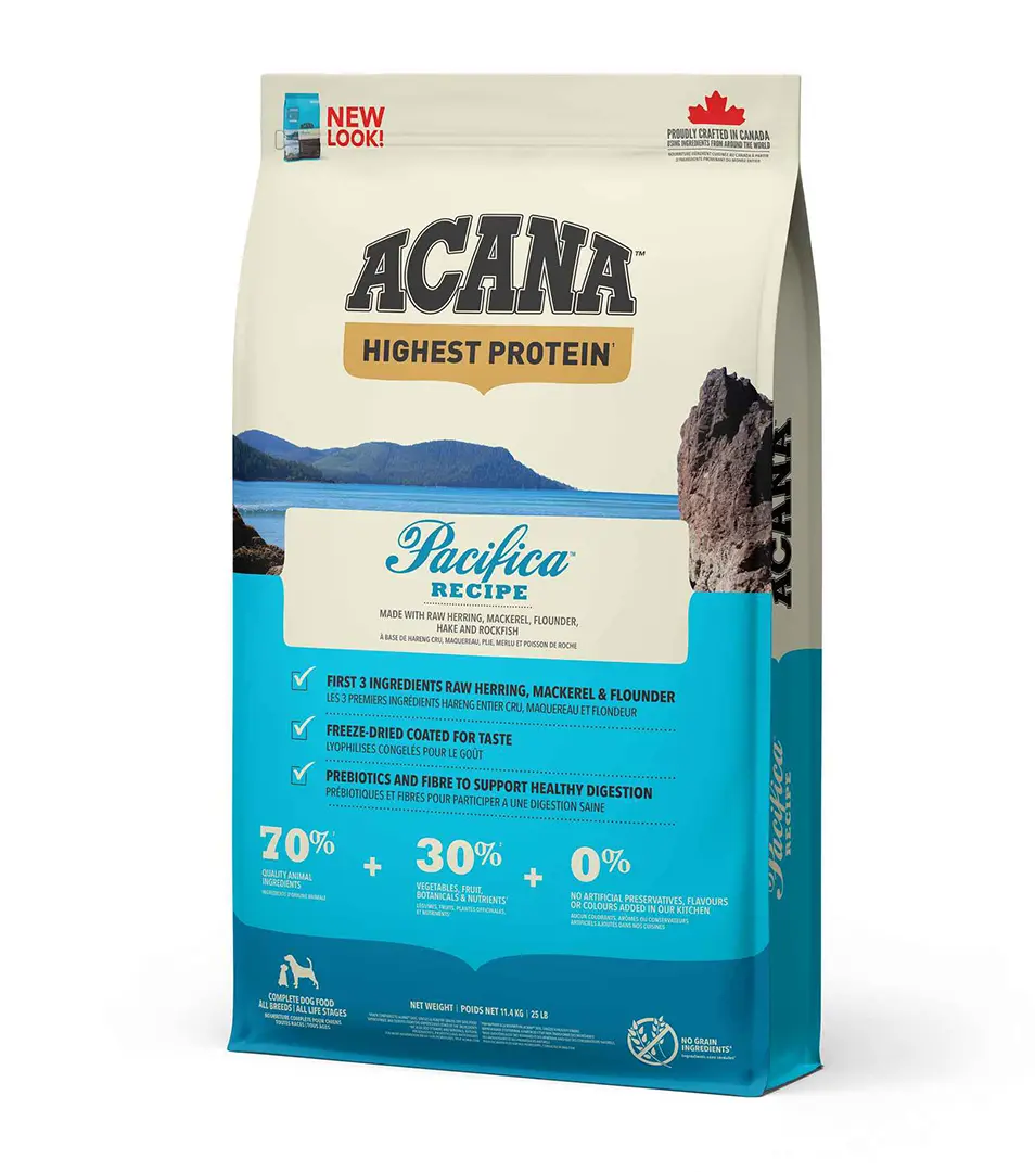 ACANA PACIFICA RECIPE je kompletné krmivo vhodné pre psy všetkých vekových kategórií a plemien. Granule s nízkym obsahom sacharidov a vysokým obsahom proteínov. Obsahuje voľne lovené ryby ako sú sleď, makrela, platesa, treska, ostriež. Receptúra je úplne bez obilnín.