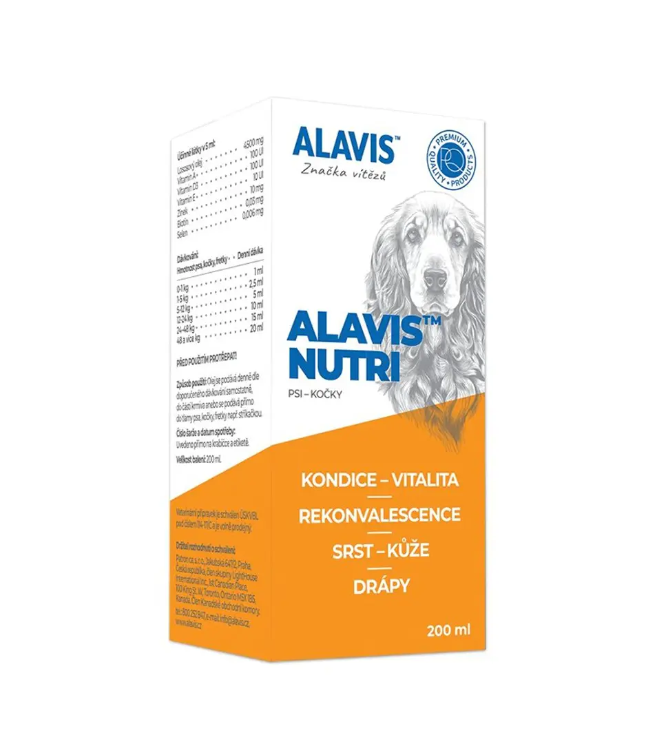 ALAVIS™ Nutri je veterinárny prípravok obsahujúci lososový olej, vitamíny (A, D3, E, biotín) a minerálne látky (Zn, Se) pre rekonvalescenciu, lepšiu kondíciu a vitalitu a pre kvalitnú, lesklú a zdravú srsť, kožu a pazúriky u psov, mačiek a fretiek .