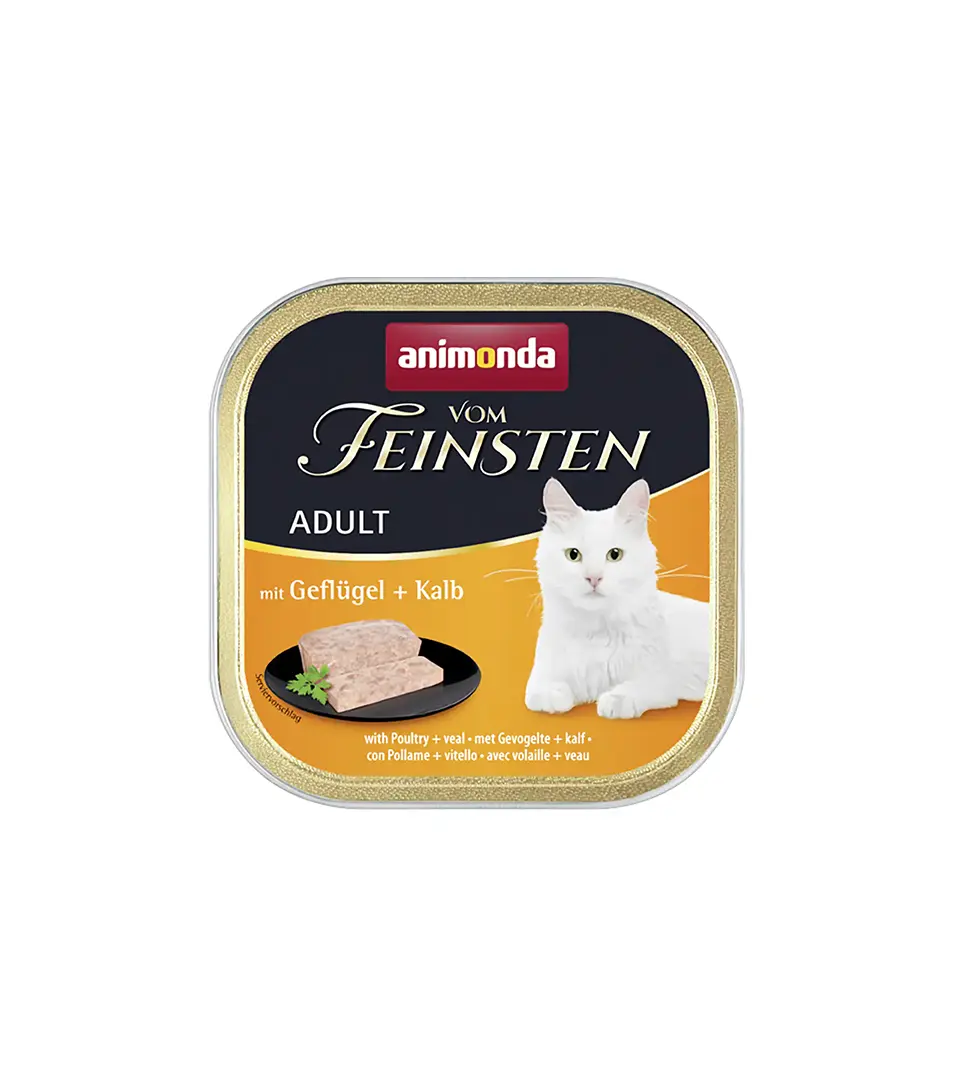 Vom Feinsten Adult prináša lahodnú, zdravú a vyváženú výživu na najvyššej úrovni pre dospelé mačky vo veku od 1 do 6 rokov. Starostlivý výber a kvalita mäsitých surovín zaručuje jedinečný pôžitok. Táto jemná gurmánska paštéta poskytuje všetky základné živiny, ktoré potrebuje dospelá mačka.