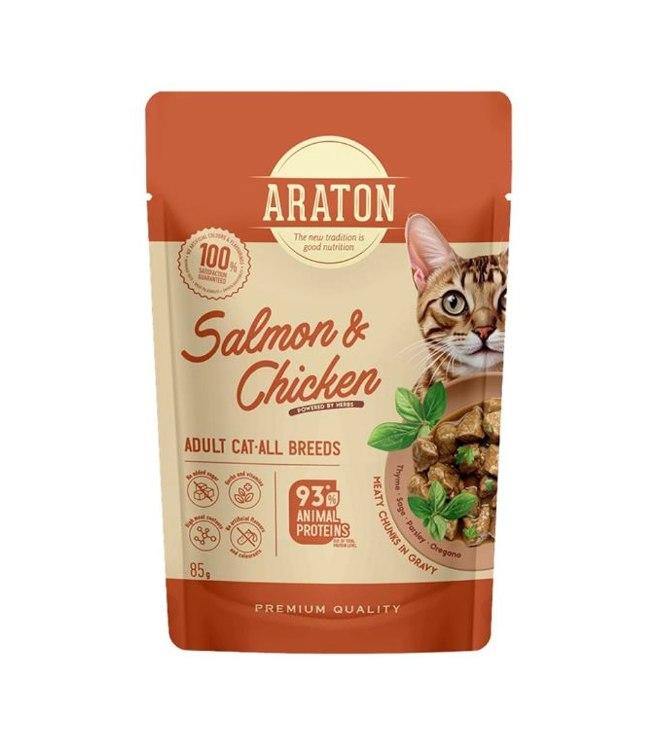 Kompletné mokré krmivo Araton bolo vyvinuté pre každodenné kŕmenie dospelých mačiek všetkých plemien bez zbytočných prísad, ale s maximálnymi zdravotnými prínosmi. Kúsky v šťavnatom omáčke, 76 % zvieracích a vodných zložiek, doplnené bylinkami – všetko vytvorené s ohľadom na prirodzené inštinkty mačiek a želanie majiteľov poskytnúť im to najlepšie.