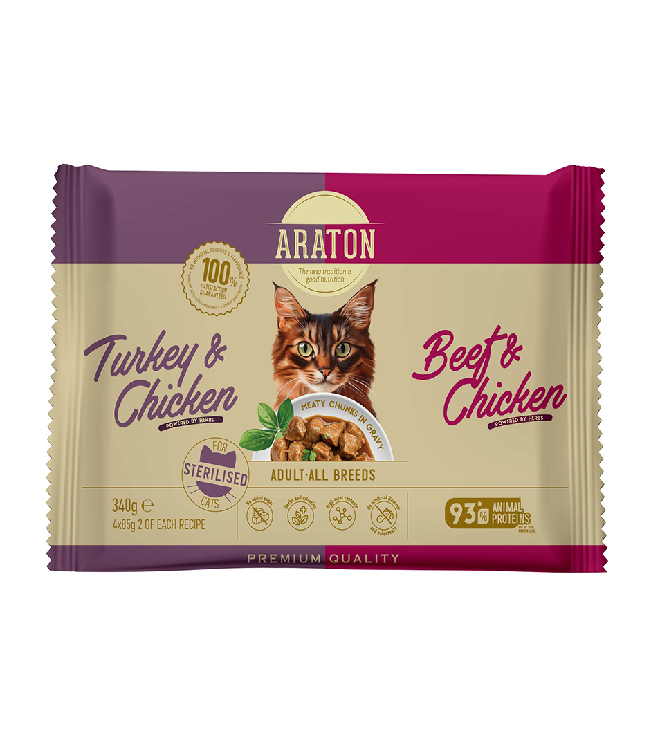 Kompletné mokré krmivo Araton s morkou a kuracím mäsom a s hovädzím mäsom a kuracím mäsom je chuťovo vyvážená sada dvoch receptúr vyvinutá špeciálne pre kastrované mačky, ktoré ocenia rozmanitosť a potrebujú udržiavať vyváženú stravu. Po kastrácii má telo tendenciu ukladať tuk a zvyšuje sa chuť do jedla. Táto sada pomáha udržiavať optimálnu fyzickú kondíciu bez stresu a bez kompromisov v chuti.