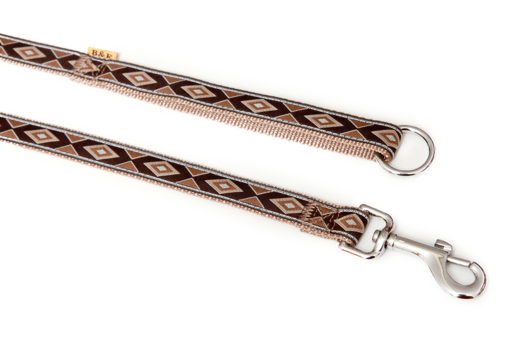Vodítko z popruhu s motivem kosočtverců. Vodítko je pevně prošité, v uchu všitý svařovaný kroužek pro zkrácení na polovinu. Je vhodný pro střední plemena.