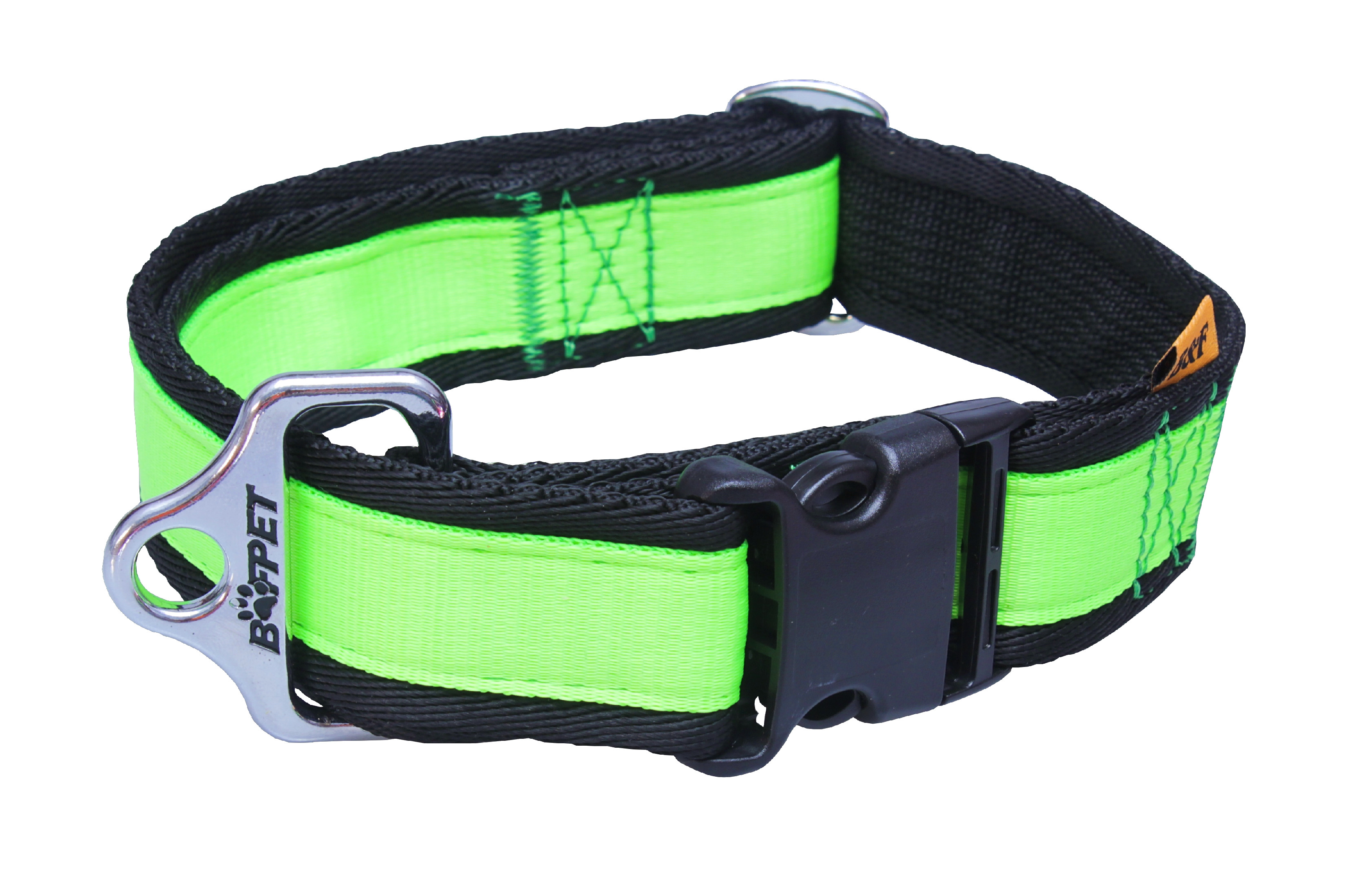 Široké obojky jsou vyrobené z měkkého popruhu v jednobarevném provedení. Zapínání na plastovou přezku, snadno nastavitelný obvod. Obojky jsou vhodnýé pro střední i velká plemena. Součástí je kovový průvlek s otvorem pro připnutí vodítka.