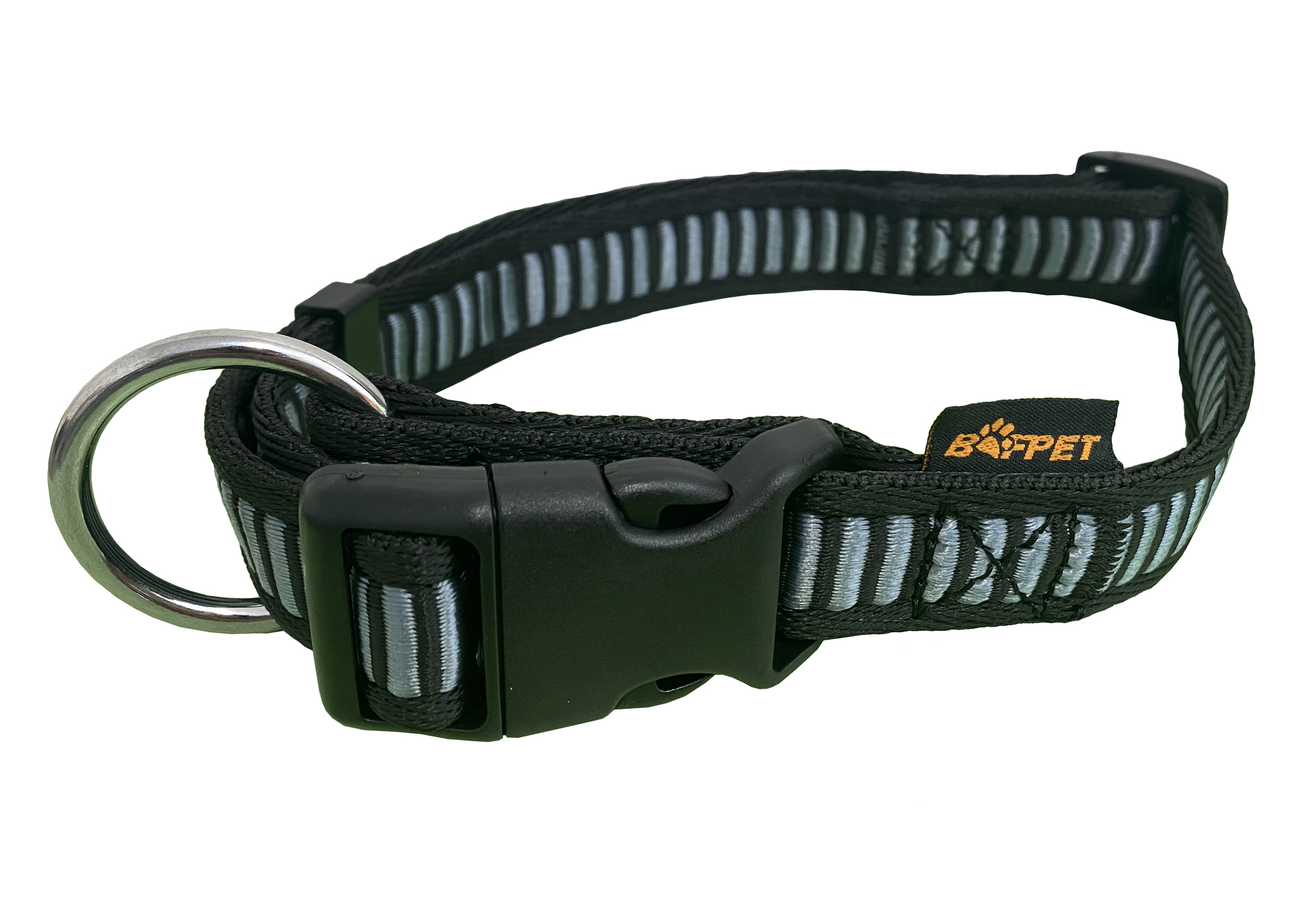 Obojky sú vyrobené z veľmi mäkkého a príjemného popruhu s vtkaným vzorom rebríka. Zapínanie na plastovú pracku, ľahko nastaviteľný obvod. Obojok je vhodný pre malé, stredné a veľké plemená.