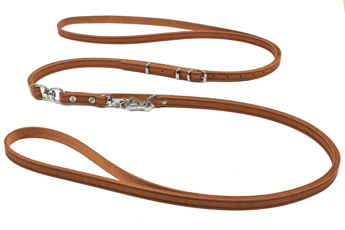 Rýchlovypúšťacie vôdzky sú vyrobené z veľmi príjemnej a mäkkej kože bez vzoru, hladké. Časť cez telo je nastaviteľná podľa požadovaného obvodu, spodná časť na prichytenie psa je na pevno ukončená kliešťovou karabínou. Dôležité: Vôdzky prevliekame pod obojok smerom od hlavy na chrbát. Sú určené pre malé lovecké plemená.