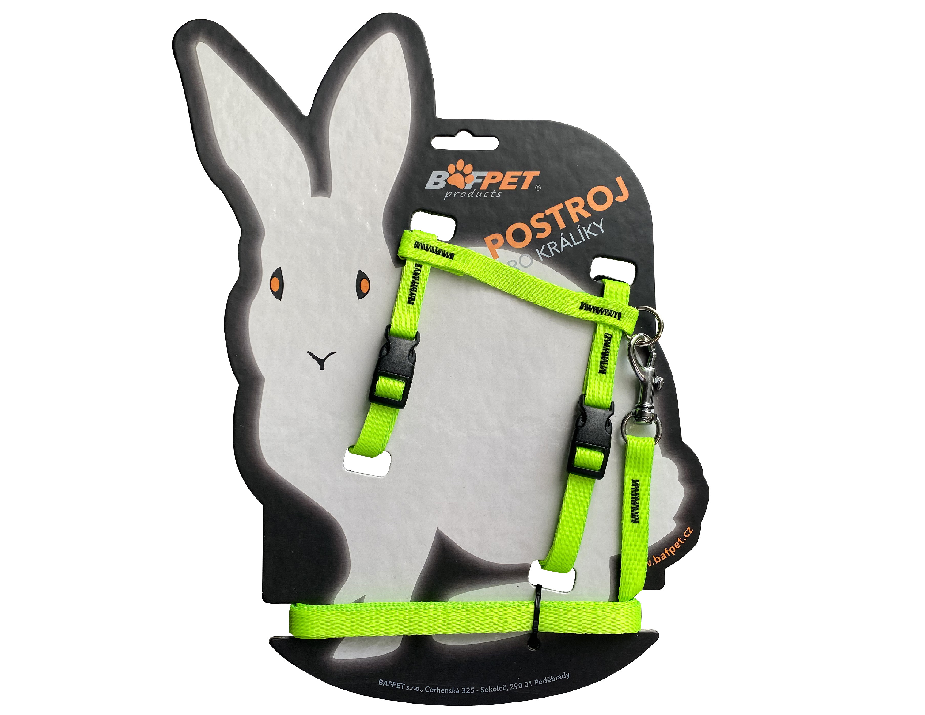 Set vôdzky a postroja je vyrobený z mäkkého popruhu. Spoje sú šité, pre možnosť štelovania sú postroje opatrené plastovou vsuvkou a prackou. Set je určený pre králiky.