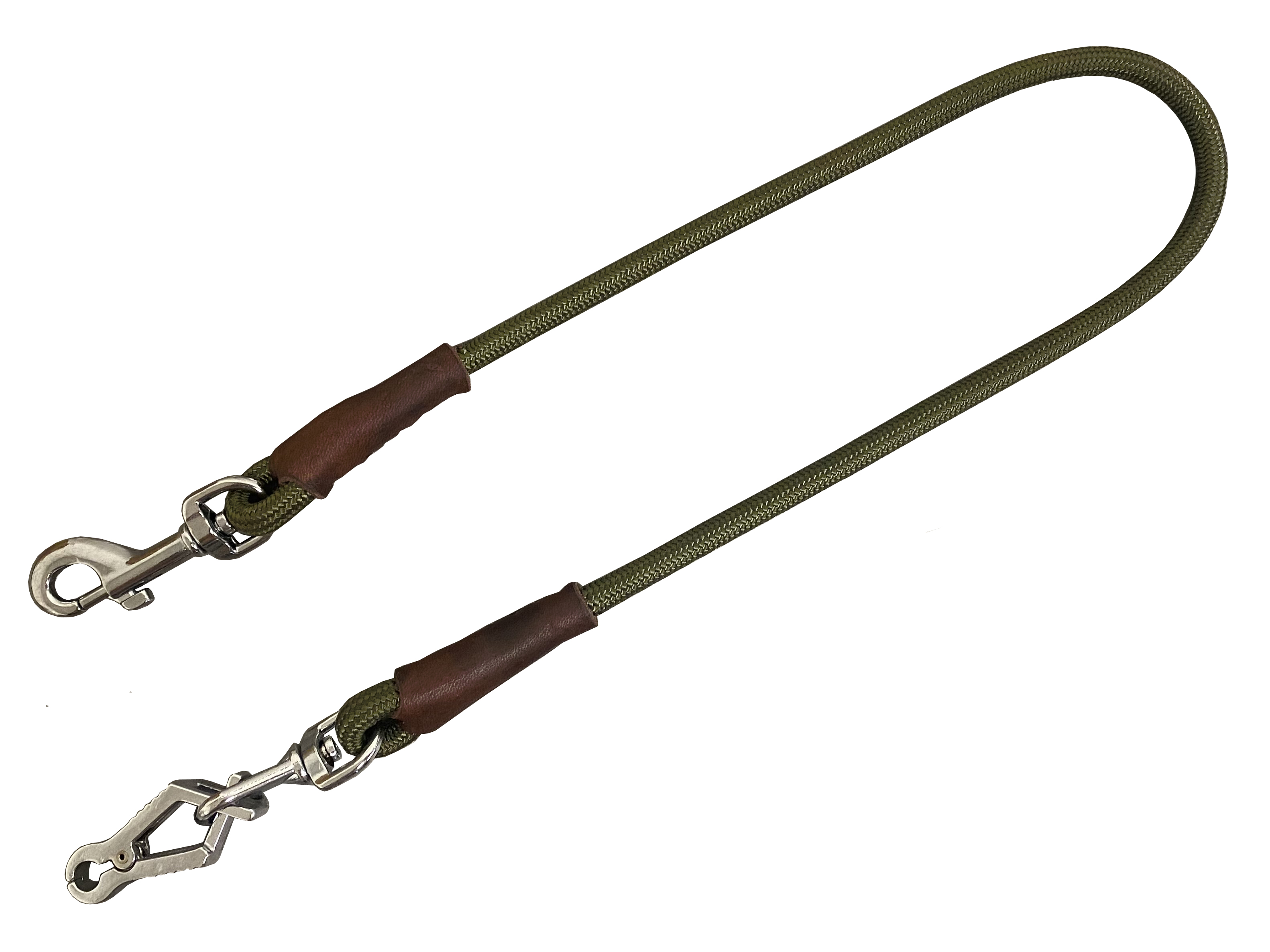 Spodný diel k vypúšťacej vôdzke je vyrobený z veľmi pevného lana POLYAMID. Všetky spoje sú šité a schované pod domčekom z mastnej kože. Táto časť je ukončená jedno kliešťovou a jednou hákovou karabínkou, pre možnosť voľby. K tejto časti je potrebné dokúpiť diel cez rameno, ktorá nie je súčasťou!!!