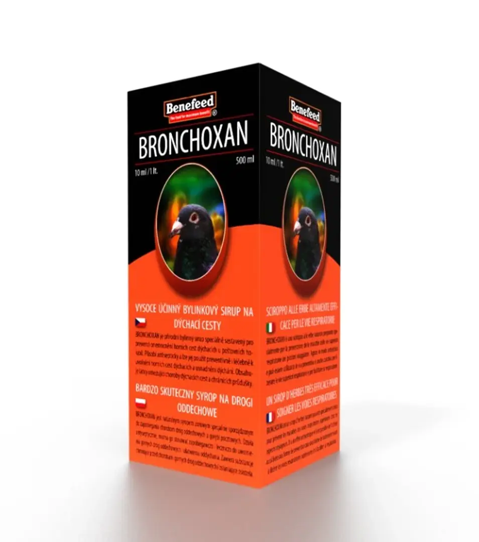 BRONCHOXAN je prírodný bylinný sirup špeciálne zostavený pre prevenciu chorôb horných dýchacích ciest u poštových holubov. Pôsobí antisepticky a môže sa použiť preventívne aj liečebne k uvoľneniu horných dýchacích ciest a na zlepšenie dýchania. Obsahuje látky obmedzujúce choroby dýchacích ciest a chrániacich priedušky. Významne obmedzuje zápaly dýchacích ciest a napomáha k ich prečisteniu. V prípade zápalu rozpúšťa hlien a uľahčuje vylučovanie sekrétu.