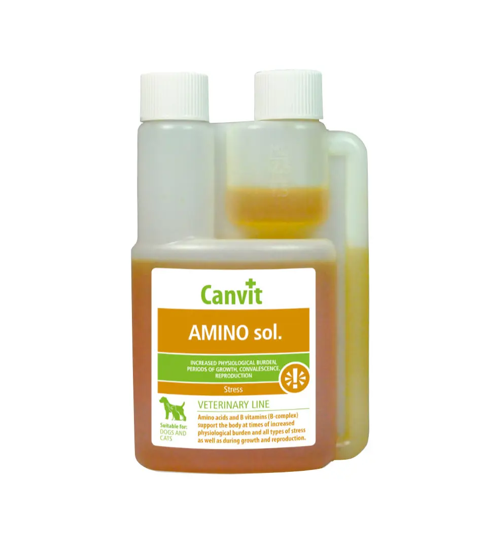 Canvit Amino sol. je komplex hydrofilných vitamínov skupiny B, aminokyselín, glukózy a solí vo forme tekutého roztoku. Tieto látky podporujú organizmus pri zvýšenej fyziologickej záťaži, v období rastu, rekonvalescencie, reprodukcie a stresu všetkého druhu (teplotné, nutričné, transportné).