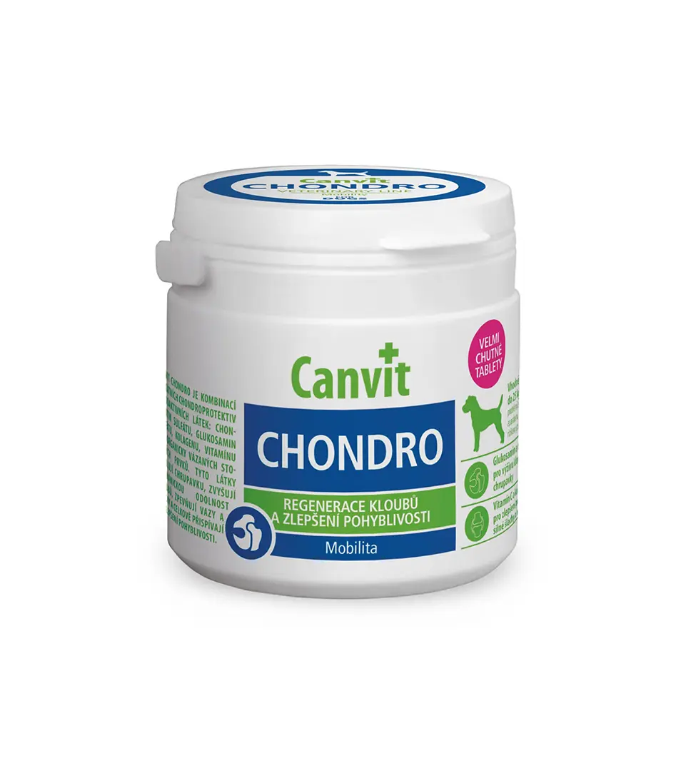 Canvit Chondro je zdrojom komplexnej kĺbovej výživy pre regeneráciu a ochranu chrupaviek, väzov a zlepšenie hybnosti kĺbov počas ich vývoja, rastu a bežného namáhania u rastúcich a zdravých psov. Tablety Canvit Chondro sú psy výborne akceptované vďaka hydrolyzátu kuracej a bravčovej pečene. Tablety Canvit Chondro s príchuťou pečene si váš pes zamiluje.