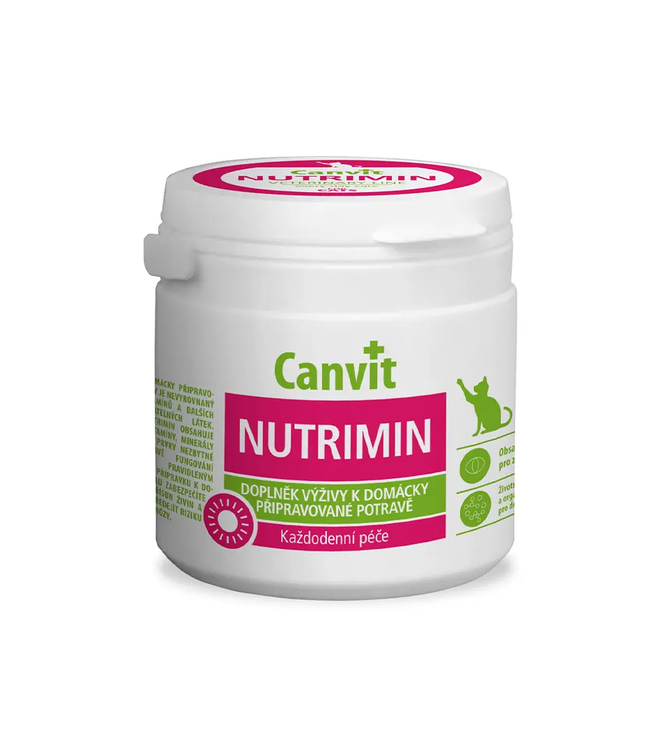 Komplex 14 vitamínov, mikroprvkov a Taurínu s vysokou biologickou dostupnosťou pre vyvážené kŕmenie a prevenciu hypovitaminóz u mačiek kŕmených mäsom a domácou stravou. Doma pripravovaná strava a mäso pre mačky obsahuje dostatočné množstvo proteínov, sacharidov a tukov, ale z pohľadu obsahu vitamínov, minerálov a Taurínu je táto strava nedostatočná. Príkladom môže byť celkom bežné kŕmenie mačiek mäsom, ktoré obsahuje veľké množstvo fosforu, ale minimum biologicky dostupného vápnika. Dlhodobé kŕmenie stravou chudobnou na vitamíny, minerály a Taurín môže u mačiek spôsobiť nenávratné poškodenie zdravotného stavu. Canvit Nutrimin obsahuje komplex 14 vitamínov, organicky viazaných mikroprvkov a Taurinu na prípravu vyváženej kŕmnej dávky.
