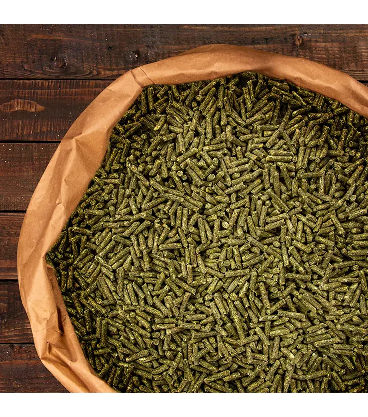 ZLOŽENIE: lucernové úsušky, pšeničné otruby, jačmeň, ovsené otruby, slnečnicový extrahovaný šrot, sójový extrahovaný šrot, rastlinný tuk (slnečnicový, palmový, repkový), droždie, chlorid sodný, uhličitan vápenatý, vitamínovo - minerálny premix
