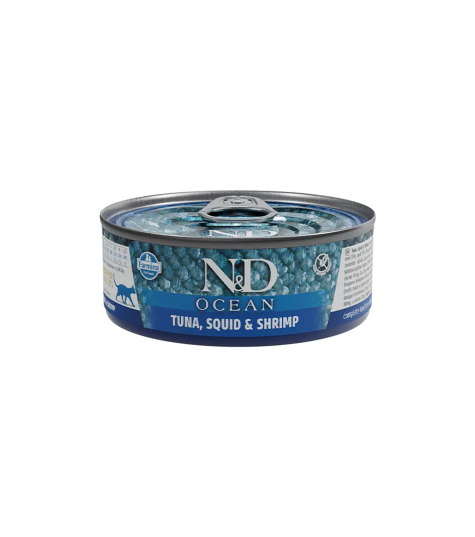 Farmina N&D cat OCEAN tuna, squid & shrimp konzerva 70 gSkladom1,59 €/ KS1,29 € bez DPH