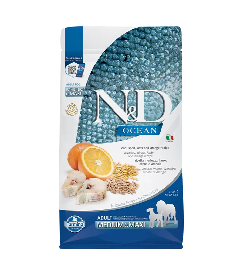Farmina N&D dog OCEAN (AG) adult medium & maxi, codfish, spelt, oats & orange 2,5 kgSkladom23,02 €/ KS18,72 € bez DPH