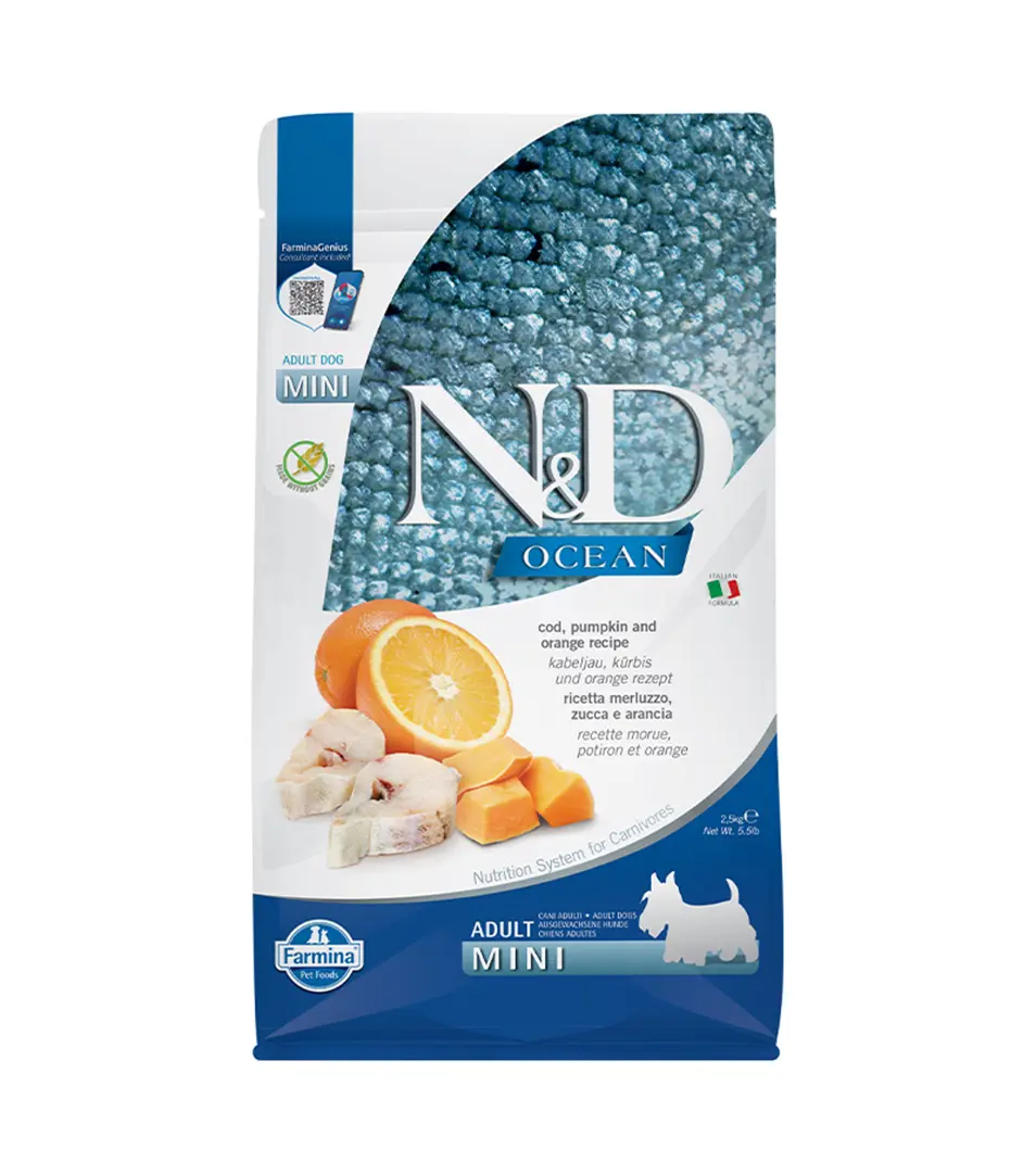 Farmina N&D dog OCEAN (AG) adult mini, codfish, spelt, oats & orange 2,5 kgSkladom23,02 €/ KS18,72 € bez DPH