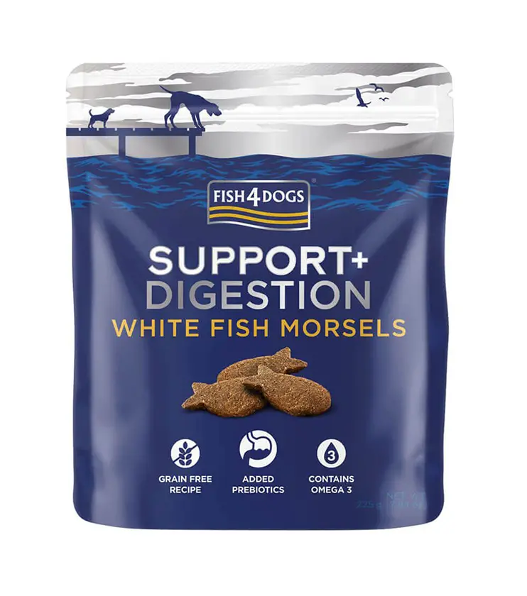 FISH4DOGS Pamlsky pre psov na podporu trávenia s kúskami bielej ryby 225gNie je skladom5,95 €/ bal4,84 € bez DPH