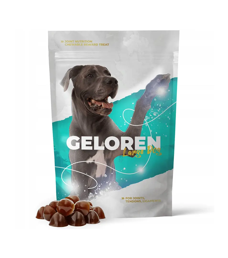 Geloren Large Dog predstavuje doplnkovú výživu na pohybový aparát psov veľkých plemien vo forme ochutenej žuvacej maškrty s vysokou dávkou kyseliny hyalurónovej, chondroitín sulfátu, hydrolyzovaného kolagénu a želatíny. Je vhodný pre rýchlo rastúce, ťažké a športové plemená, pre starých a obéznych psov a psov s problémami kĺbov. Na kĺby, väzy, šľachy