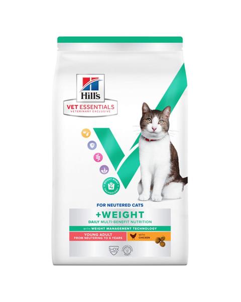 Hill's VET ESSENTIALS MULTI-BENEFIT krmivo s kuraťom pre mladé dospelé mačky je kompletná, všestranne prospešná výživa pre dospelé kastrované mačky od zákroku až do 6 rokov veku s tendenciou priberať na váhe.