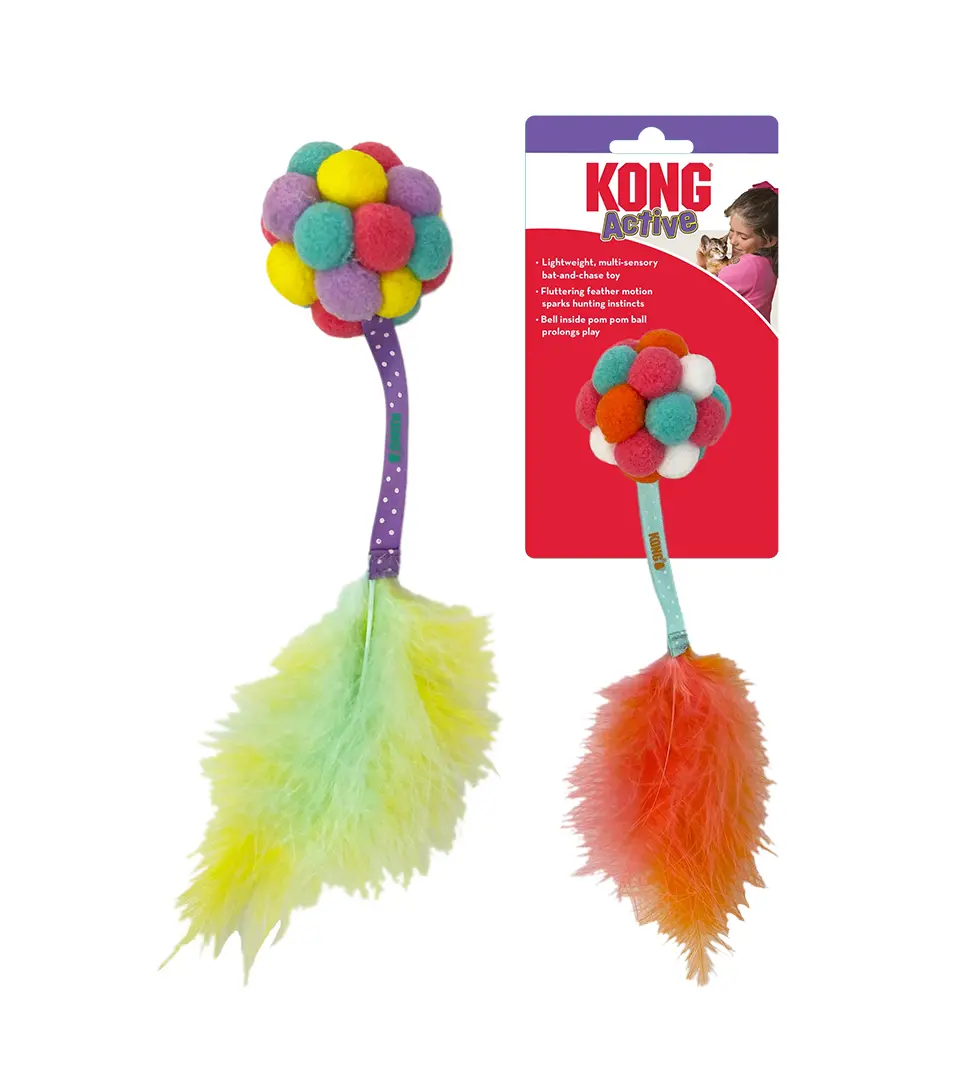 Hračka pre mačky KONG Active Bubble Ball. Bublinkový chvost s pierkami prebúdza lovecké inštinkty každého malého tigra, zatiaľ čo zvonček vo vnútri lopty predlžuje záujem o hračku. Starostlivo vytvorený dizajn produktu stimuluje zmysel vašej mačky pr