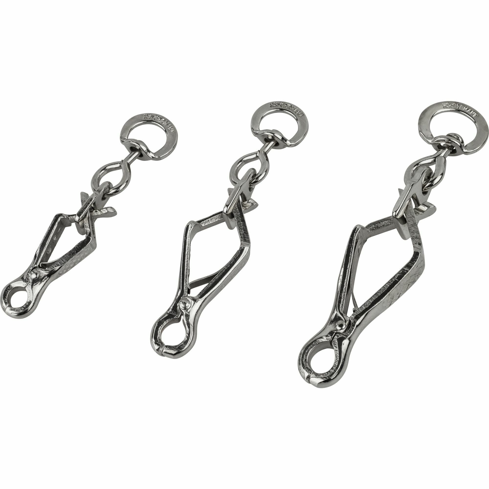 Kliešťové vypúšťacie karabínky s navareným otočným okom. Jednoduché a rýchle upevnenie a uvoľnenie. Vynikajúca pevnosť v ťahu vďaka predcíznej práci. Karabínka je zabezpečená proti neúmyselnému otvorenie prostredníctvo protitlaku aj keď je v ťahu.
