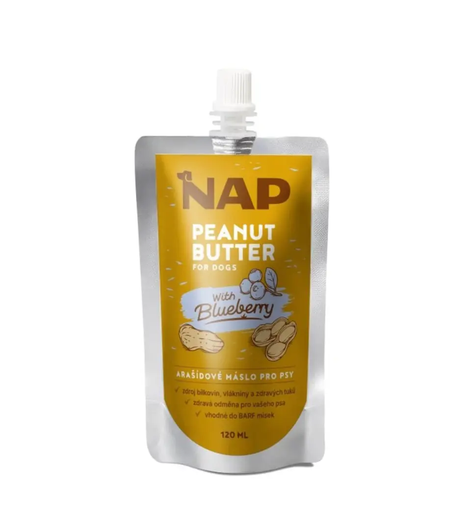 NAP Arašidové maslo pre psy - čučoriedka 120 mlSkladom6,43 €/ KS5,23 € bez DPH