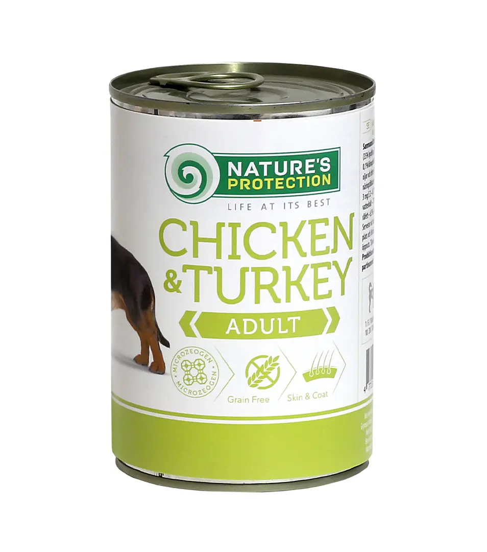 Nature's Protection je superprémiová konzerva pre dospelé psy všetkých plemien s kuracím a morčacím mäsom, podávaná v lahodnom vývare a doplnená minerálmi. Hlavným zdrojom bielkovín je kvalitné kuracie a morčacie mäso. Toto krmivo je mäkké a ľahko žuvateľné, zloženie mäsa a vývaru je vysoko stráviteľné. Konzervy Nature's Protection sú navrhnuté tak, aby spĺňali rôzne potreby mladých a dospelých psov. Hlavným zdrojom bielkovín v tomto krmive pre domáce zvieratá je mäso s vysokou výživovou hodnotou.
