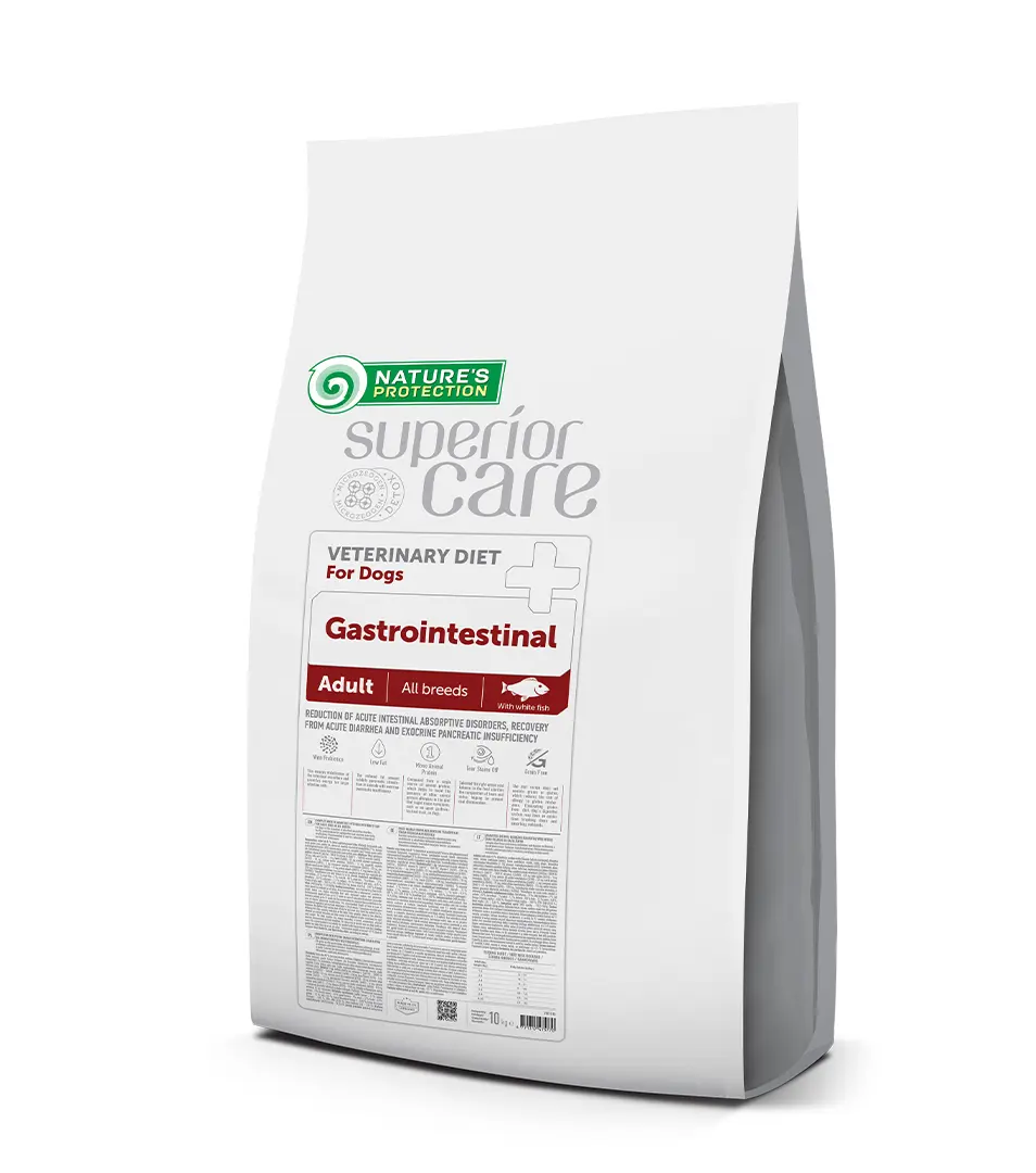 NATURE'S PROTECTION SUPERIOR CARE VETERINARY DIET pre dospelé psy všetkých plemien s bielou rybou je super prémiové kompletné a vyvážené suché krmivo pre psov špeciálne vyvinuté tak, aby spĺňalo špecifické zdravotné potreby psov s určitými zdravotnými problémami. Tieto typy krmív poskytujú veterinárnej strave účinnú rovnováhu živín a podporujú zdravie a pohodu domáceho zvieraťa. Zloženie tohto výrobku je vytvorené tak, aby upokojovalo tráviaci trakt, podporovalo zdravé trávenie a kontrolovalo príznaky, ako sú tráviace problémy, chronická hnačka alebo zvracanie.