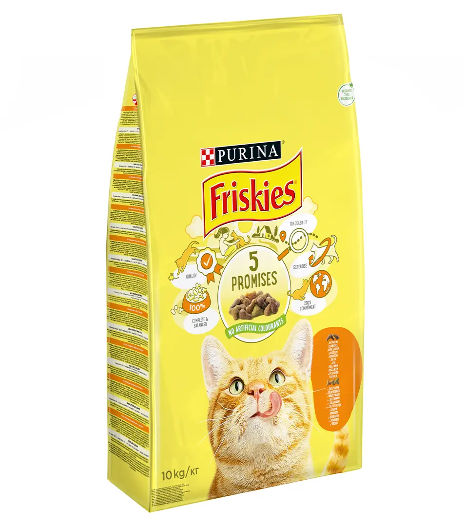 Friskies® 5 sľubov. Odo dňa, keď ste si zaobstarali mačku, ste sa zaviazali. Dali ste sľub, že sa o ňu budete starať, správne ju kŕmiť a umožníte jej žiť šťastný život, ktorý prinesie do vášho domova mnoho radosti. Vďaka niekoľko desaťročným skúsenostiam a odborným znalostiam, vďaka lahodnému a kvalitnému krmivu prináša Friskies šťastie mačkám každý deň už celé generácie. S touto poctou prichádza zároveň aj veľká zodpovednosť. A rovnako ako vy, aj my vo Friskies robíme maximum pre to, čo sme si sľúbili. Pre vašu mačku a pre vás. 5 sľubov, pretože nám záleží na: