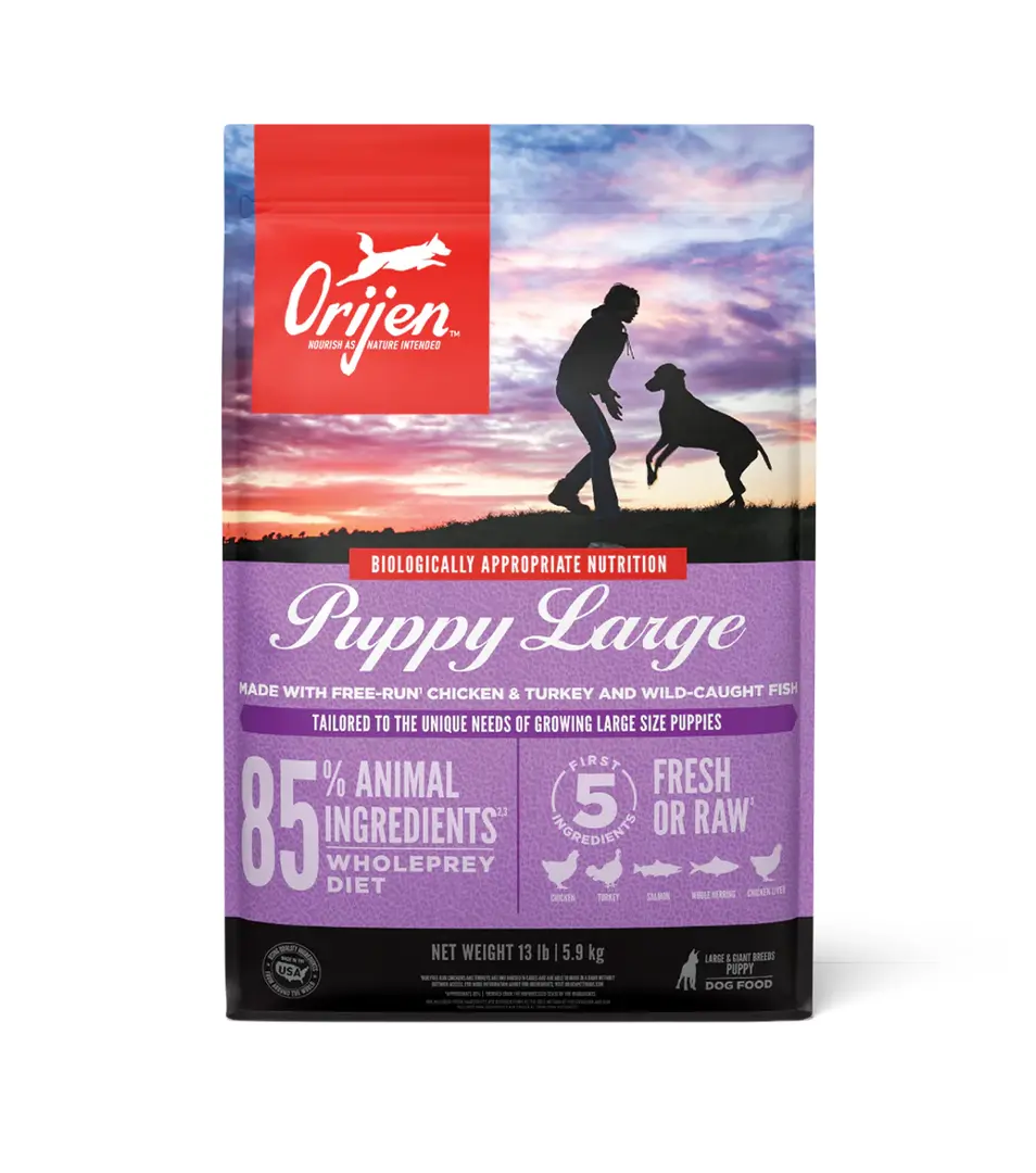 ORIJEN PUPPY LARGE je kompletné krmivo pre šteňatá veľkých plemien. Obsahuje vysoký podiel proteínov z voľne chovaných kurčiat a moriek, rýb lovených v prírodných vodách a vajec z hniezdových chovov, to všetko je nám dodávané čerstvé v bohatom výživnom podiele Celej koristi. Plné živín, ktoré podporujú vrcholovú kondíciu a správny vývoj, zaručia, že váš pes bude zdravý, spokojný a silný. Receptúra je úplne bez obilnín.