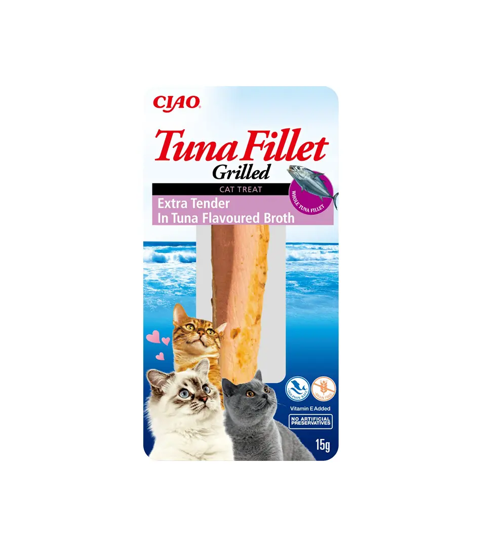 Churu Grilled pamlsky sú šťavnaté filé z tuniaka bohaté na proteíny, ručme rezané, ľahko grilované a zabalené v lahodnom vývare z morských plodov. Majú nízky obsah kalórií, sú bez obilovín, konzervantov, umelých farbív, s vysokým obsahom vody.