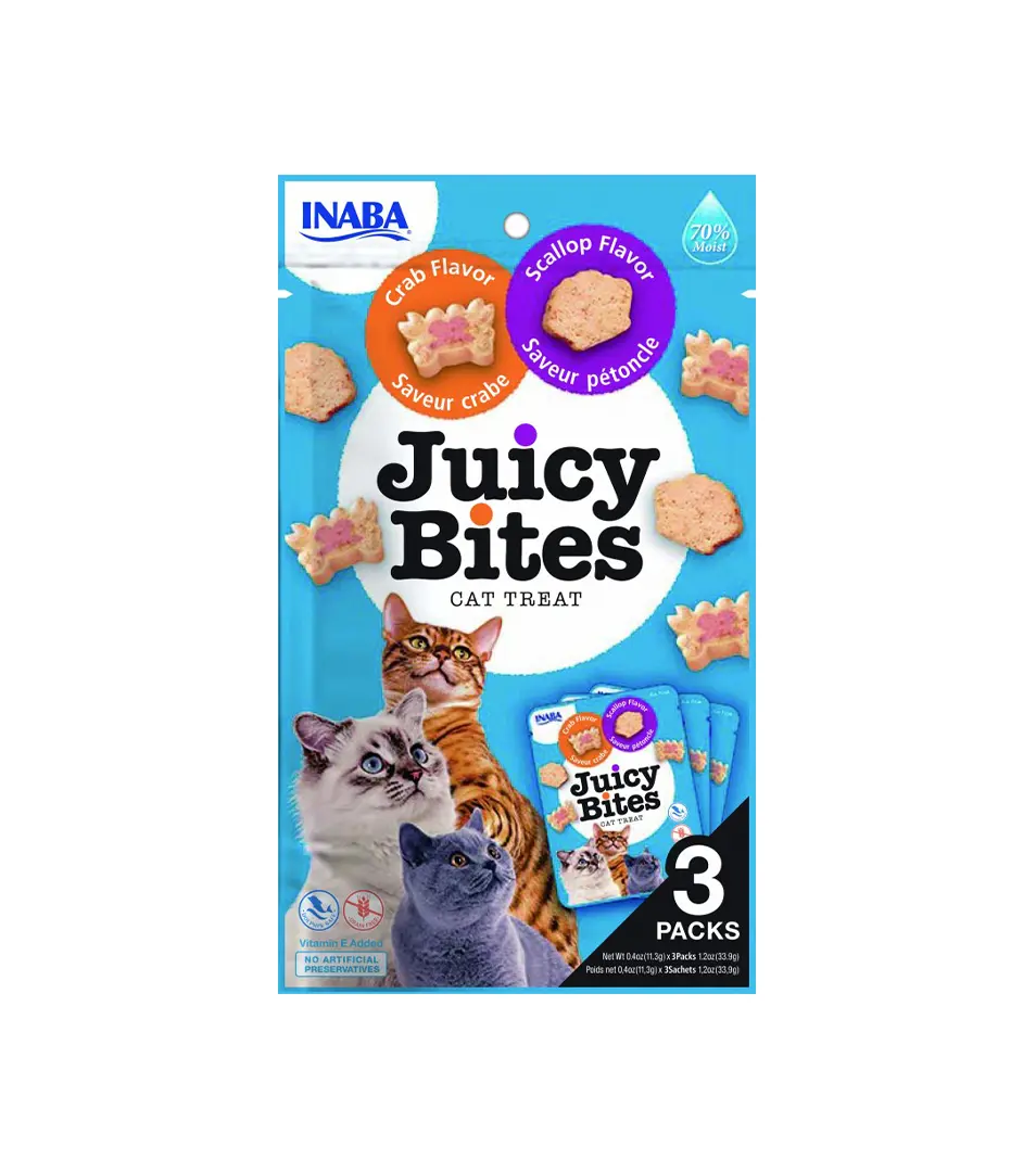 Juicy Bites sú šťavnaté maškrty, ktorým vaša mačka neodolá. Jemné pochúťky s prírodnými arómami, extraktom zo zeleného čaju a vitamínom E. Bez obilnín, konzervantov a umelých farbív. Každé balenie obsahuje 3 samostatné balenia maškŕt, aby zostalo čo najčerstvejšie. Vo vnútri balenia nájdeme lahodné mäkké kúsočky vtipných tvarov a dvoch rôznych príchutí. Zloženie: Hrebenatka: Kuracie mäso (94,9 %), tuniak, extrakt z hrebenatky (1,5 %), tapioka (sušená), extrakt zo zeleného čaju. Krab: Kuracie mäso (98,2 %), tuniak, extrakt z kraba (0,5 %), tapioka (sušená), extrakt zo zeleného čaju.
