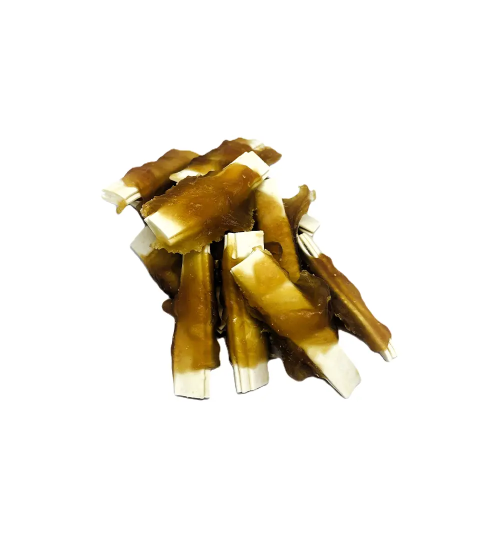 Ponúkame obľúbené prúžky z tresky, ktoré sú obalené tenkými plátkami kuracieho mäsa. Veľkosť maškrty je cca 5cm.