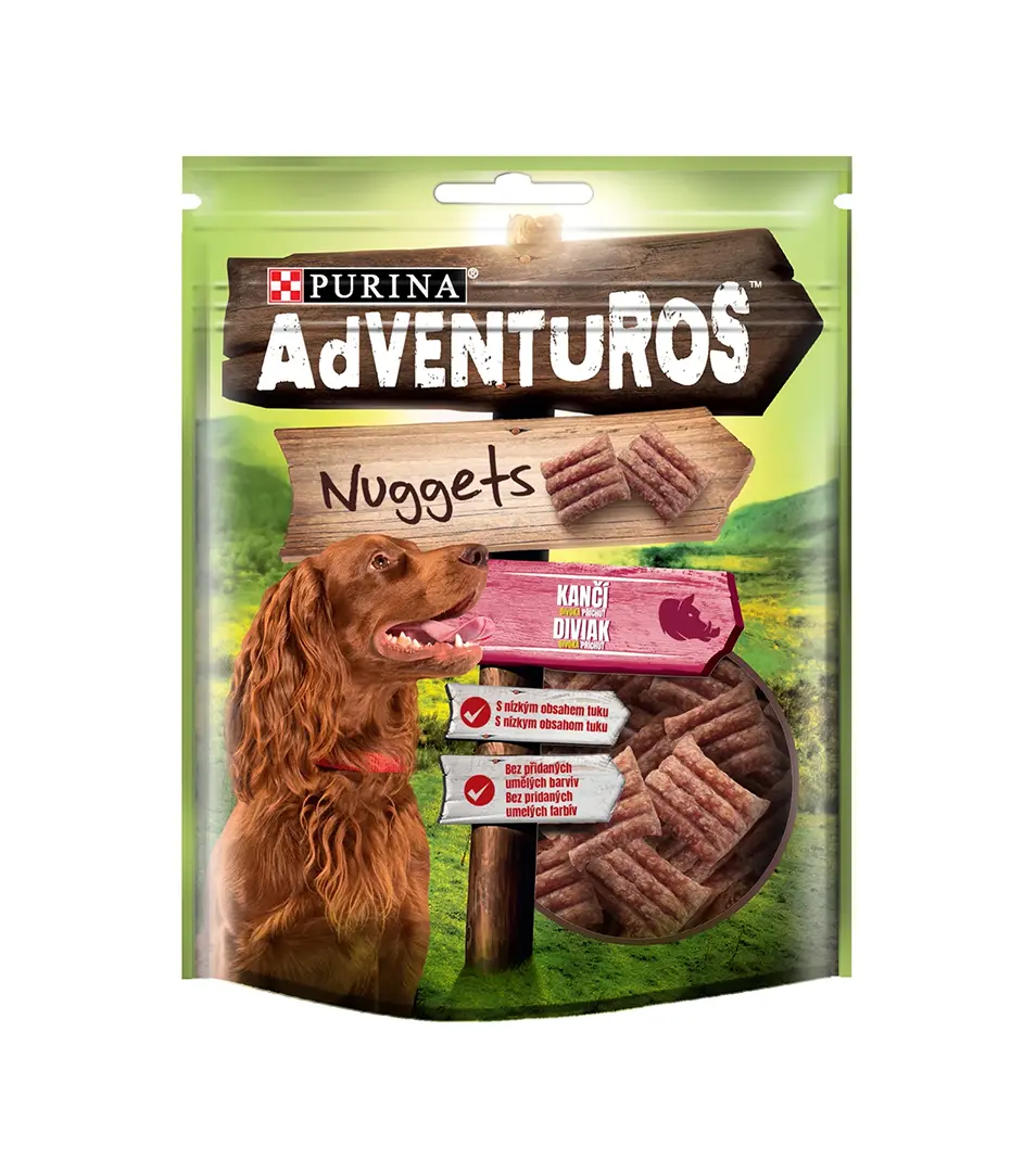 Pamlsok pre psov Purina ADVENTUROS Nuggets diviak 90 gSkladom2,08 €/ KS1,69 € bez DPH
