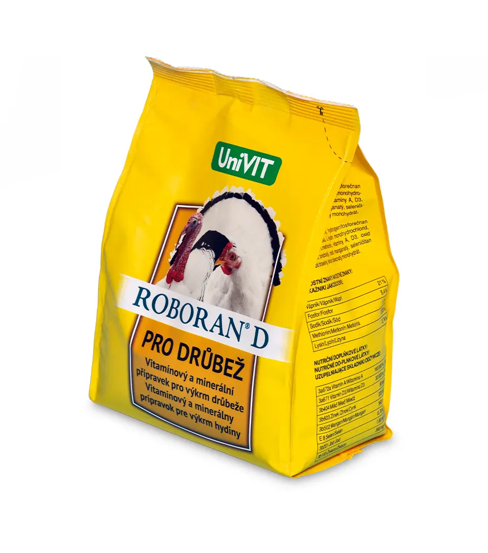 Roboran D je kompletná prísada do krmiva určená pre sliepky, kurčatá, morky, perličky, kačice a husi. Dopĺňa kŕmnu dávku o potrebné vitamíny, nenahraditeľné aminokyseliny metionín a lyzín, makrominerálne a mikrominerálne látky (Fe, Cu, Zn, Mn, J, Co, Mg, Se) a kŕmnu soľ v optimálnych dávkach. Priaznivo pôsobí na znášanie vajec, na zvýšenie prírastkov hmotnosti, k zníženiu spotreby krmiva a celkové zlepšenie kondície a zdravotného stavu hydiny..