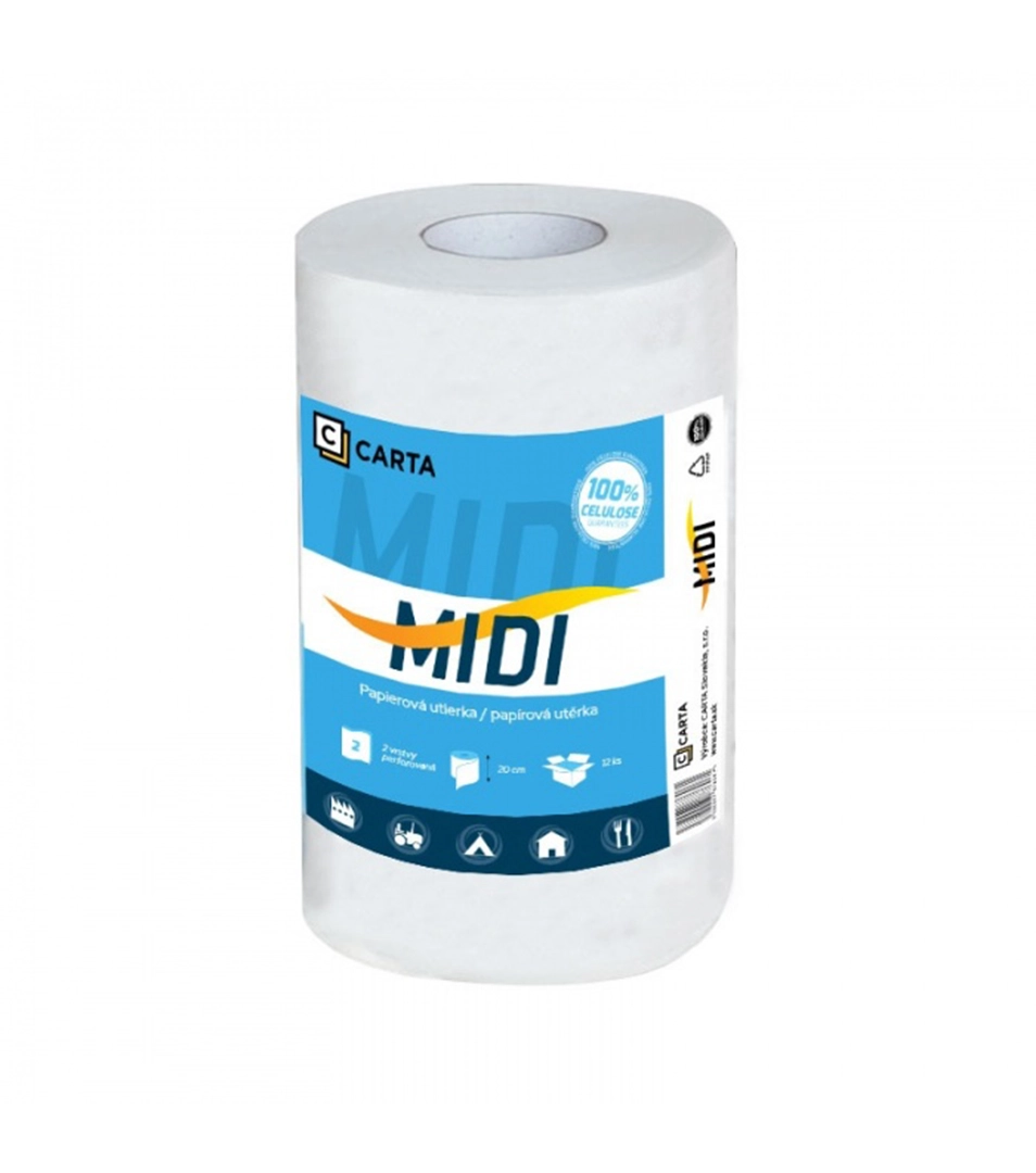 CARTA Midi je 2-vrstvová utierka zo 100% celulózy s návinom 55 m a 220 útržkami. Pevná, extra savá. Vybavená vyťahovacou dutinkou. Pre všetky typy zásobníkov. V balení je 12 ks rolí.
