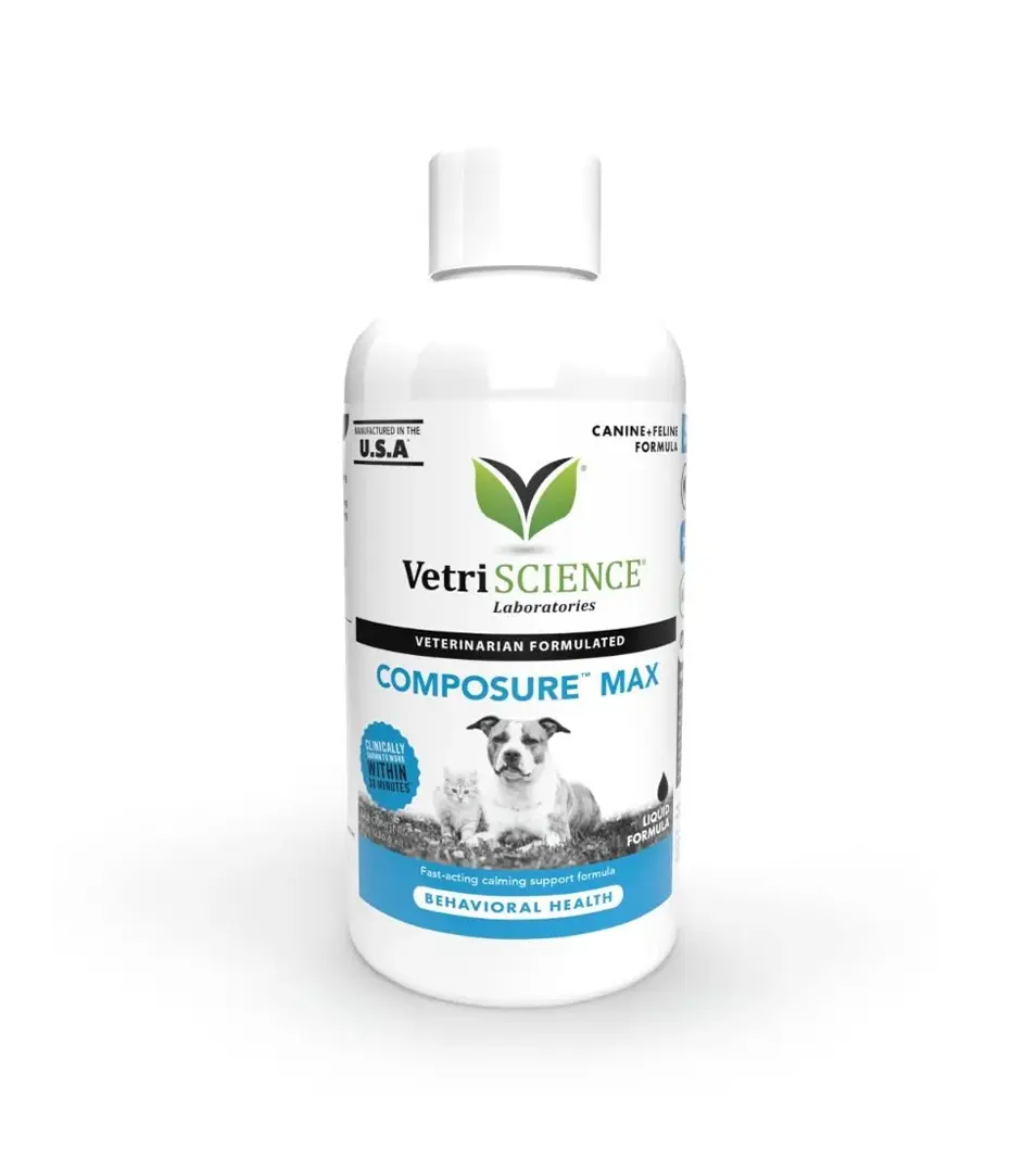 Composure ™ Max Liquid sa odporúča pre domáce zvieratá vystavené zvýšeným environmentálnym stresovým faktorom, ako sú cestovanie, stravovanie, búrky, výlety k veterinárom a iné stresové situácie. Táto receptúra obsahuje tri hlavné zložky, ktoré spolupracujú na podpore upokojenia a relaxácie bez ovplyvnenia energetických hladín alebo osobnosti domáceho zvieraťa. Komplex upokojujúci kolostrum C3 ™ podporuje zmiernenie stresu a kognitívne funkcie; L-Theanin pomáha telu produkovať ďalšie aminokyseliny, aby sa určité neurotransmitery dostali späť do rovnováhy; a vitamíny B (tiamín) pôsobia na centrálny nervový systém a pomáhajú upokojiť úzkostné zvieratá.
