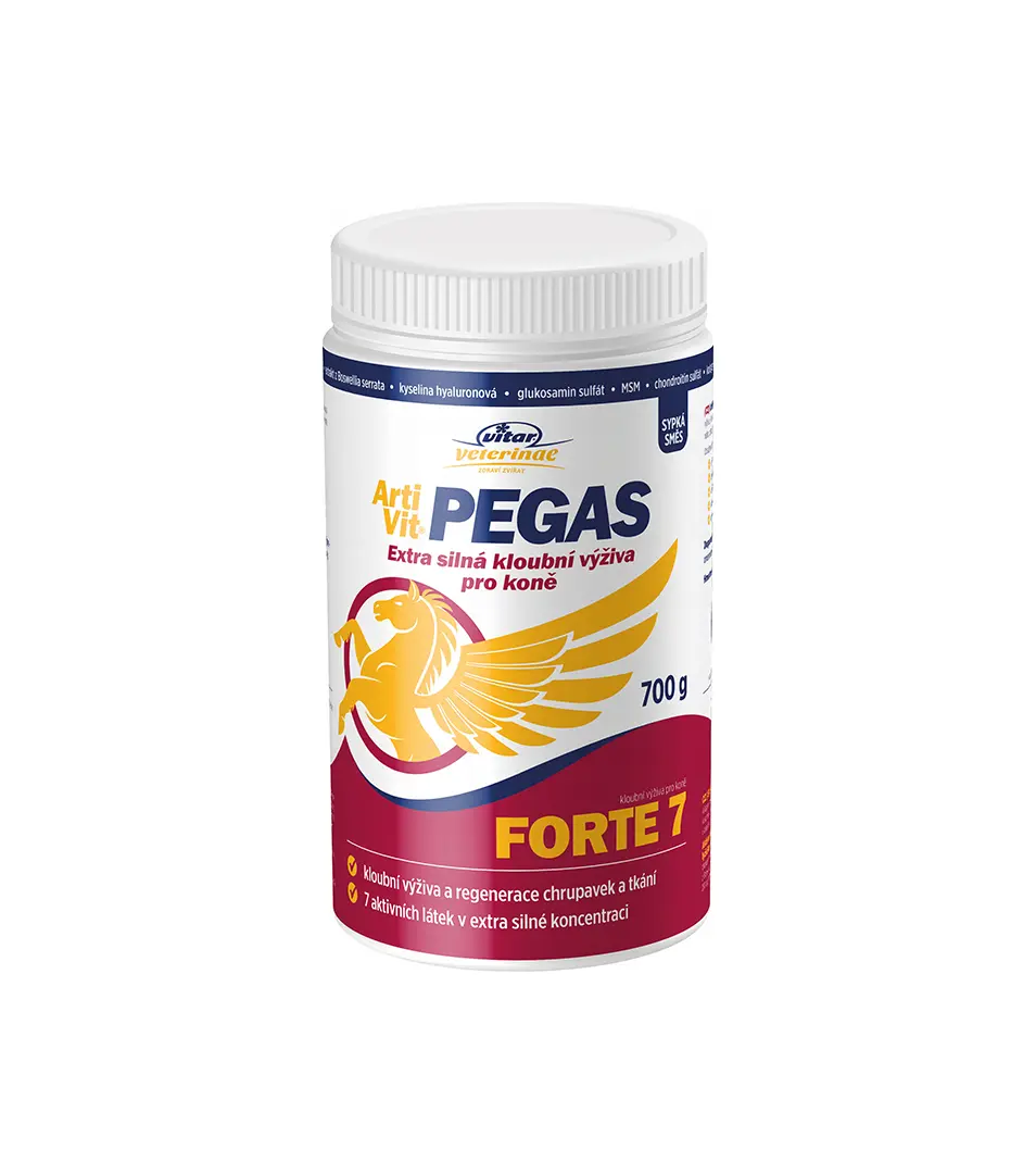 Extra silná kĺbová výživa pre kone Artivit® Pegas Forte 7 obsahuje komplex synergicky pôsobiacich látok dôležitých pre kĺbovú výživu. Forma prášku umožňuje bezproblémové podávanie i pri dlhodobej terapii. Je možné ho rozmiešať vo vode alebo priamo pridať k bežnej strave.