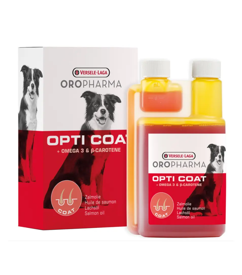 Oropharma Opti Coat je 100%-ne prírodný doplnok na báze oleja z lososa. Obmedzuje vypadávanie srsti mimo obdobia presrsťovania a pôsobí preventívne proti suchej a šupinatej koži.